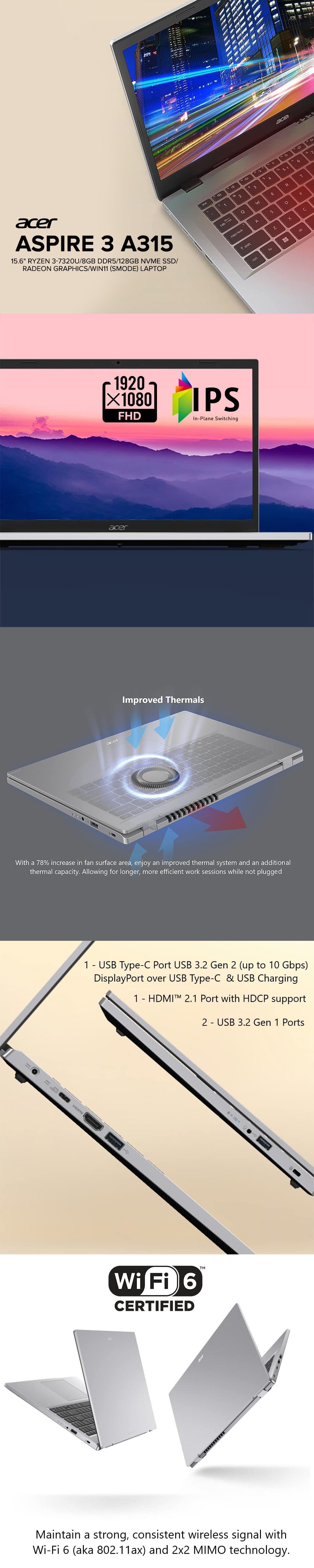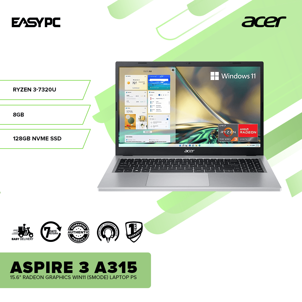 Acer Aspire 3 A315 15.6″ Ryzen 3-7320U/8GB DDR5/128GB NVMe SSD/Radeon Graphics/Win11 (Smode) Laptop PS