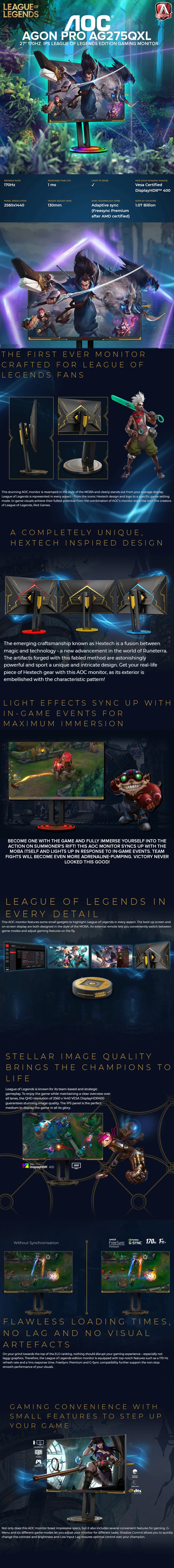 - HEXTECH DESIGN captures the magic of League of Legends in every detail with its unique, embellished monitor design, MOBA style boot up screen, and on-screen display
