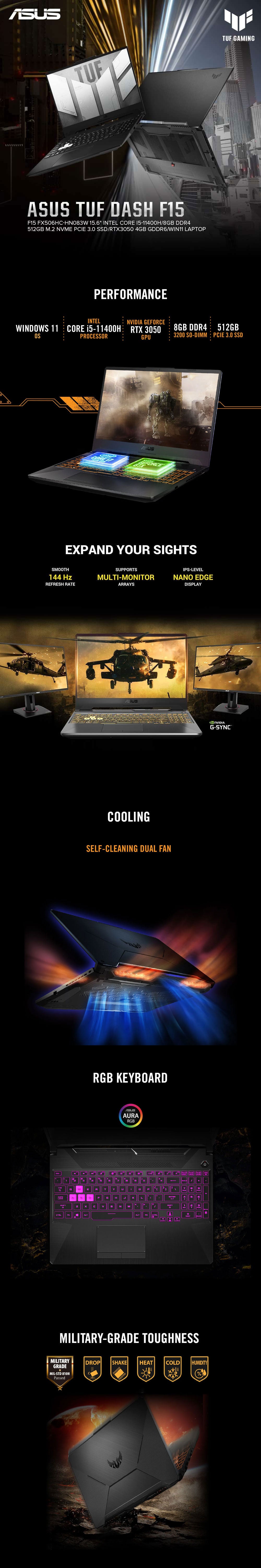 ASUS TUF Gaming F15 FX506HC-HN083W 15.6 Intel Core i5-11400H/8GB DDR4/512GB M.2 NVMe PCIe 3.0 SSD/RTX3050 4GB GDDR6/Win11 Laptop