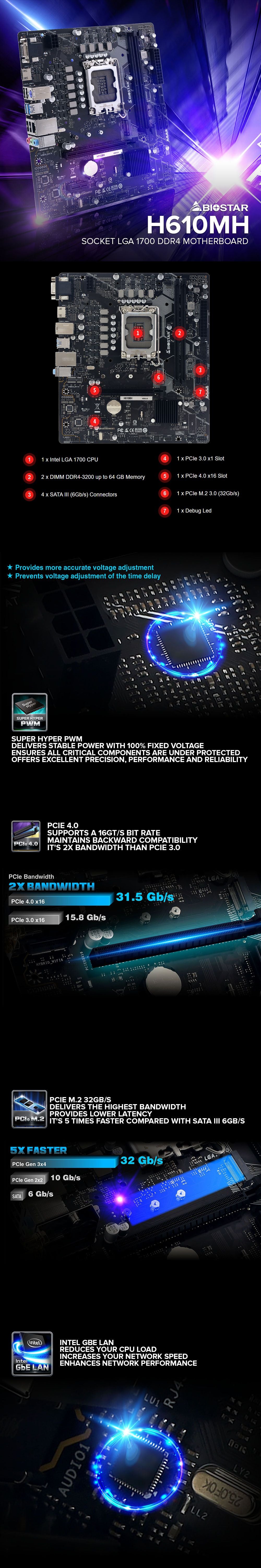 Biostar H610MH Socket LGA 1700, Supports 12th Gen Intel Core Processor, Supports PCIe 4.0 Ddr4 Motherboard