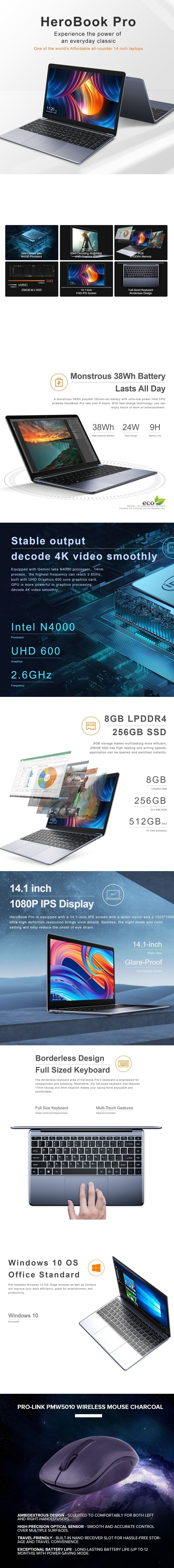 CHUWI HEROBOOK PRO Intel Celeron N4020 8GB 256GB M.2 SSD Win10 Intel UHD Graphics 600 Chiclet Keyboard Laptop + Value Plus