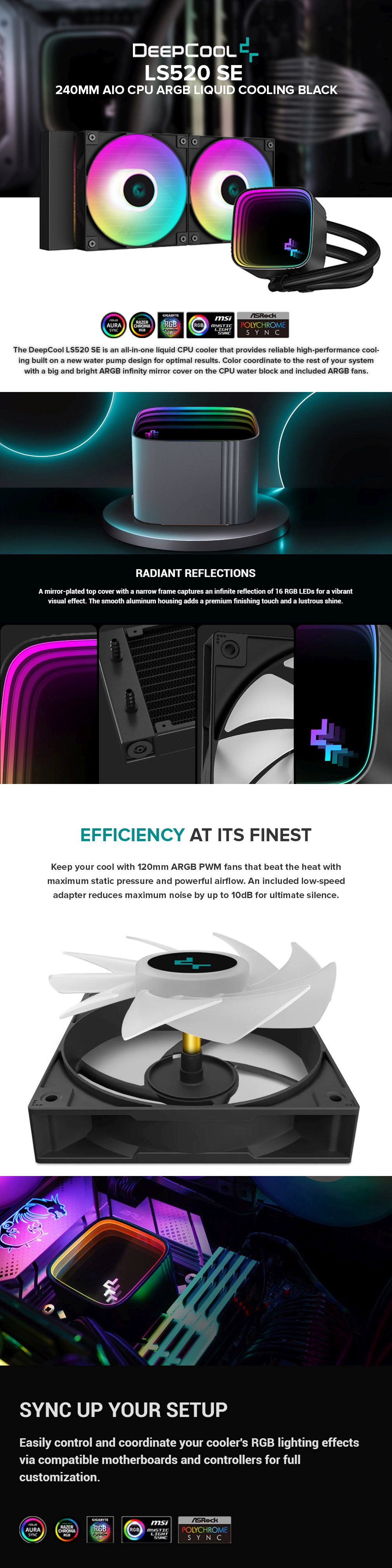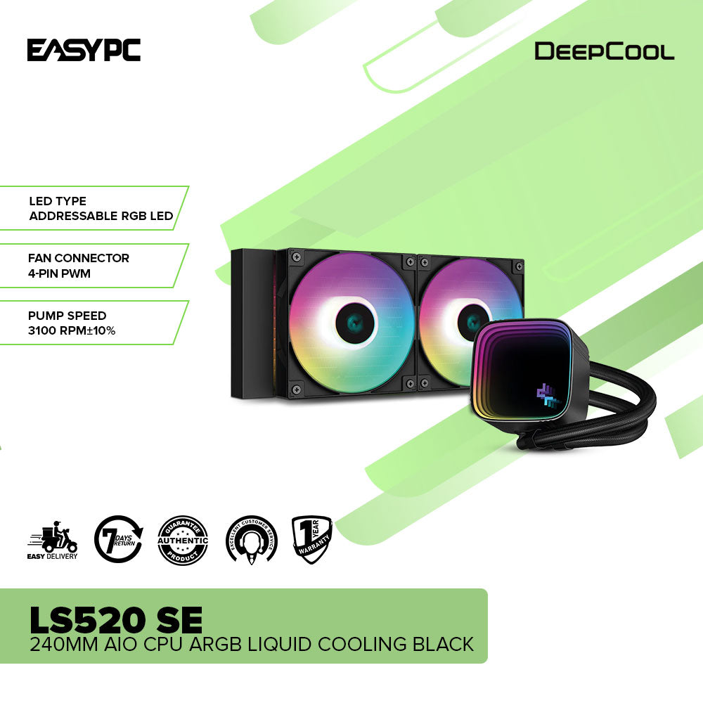 Enhance your CPU cooling with the Deepcool LS520 SE 240mm AIO Liquid Cooler in sleek black. Featuring ARGB lighting and an efficient design, it ensures top-notch cooling performance and a stylish look. Keep your CPU running smoothly with this reliable cooling solution.
