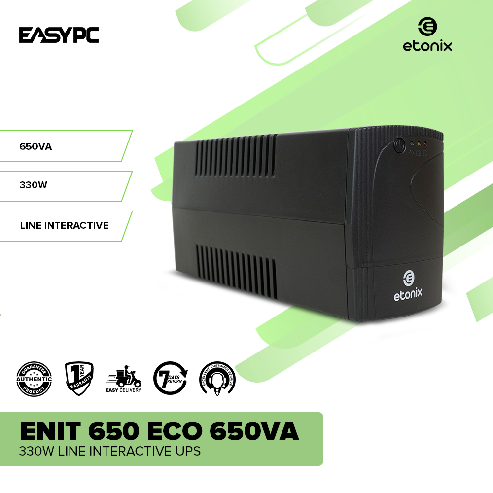Etonix ENIT 650 ECO Line Interactive UPS delivers reliable power backup with 650VA/390W capacity, protecting your devices from outages and surges. Its compact design is ideal for home or office setups, ensuring uninterrupted work and safeguarding your equipment with efficient battery management and quick response times.