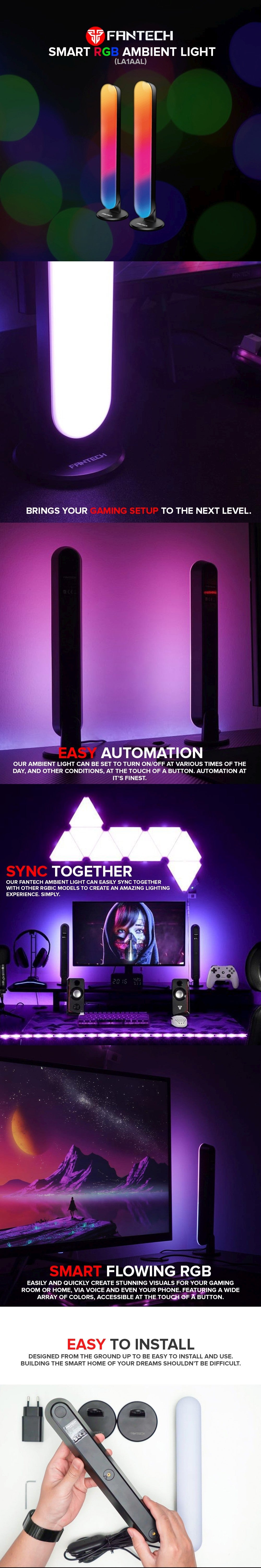 Elevate your ambiance with Fantech Smart RGB Ambient Light (LA1AAL). Effortlessly set up this sleek design, featuring flowing RGB colors. Transform your space instantly and create a vibrant, dynamic atmosphere that suits your mood. Experience easy, customizable lighting like never before.