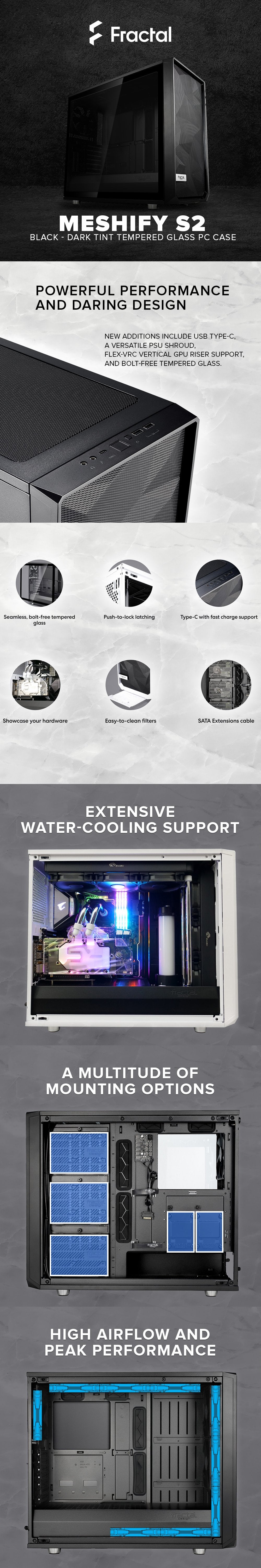 • Meshify S2 boasts immense cooling capacity with three Dynamic X2 fans, nine total fan positions, 420/360/280 mm radiator mounts, built-in pump and reservoir support, and an innovative removable top bracket. Other new additions include USB Type-C, a versatile PSU shroud, Flex-VRC Vertical GPU Riser support, and bolt-free tempered glass.