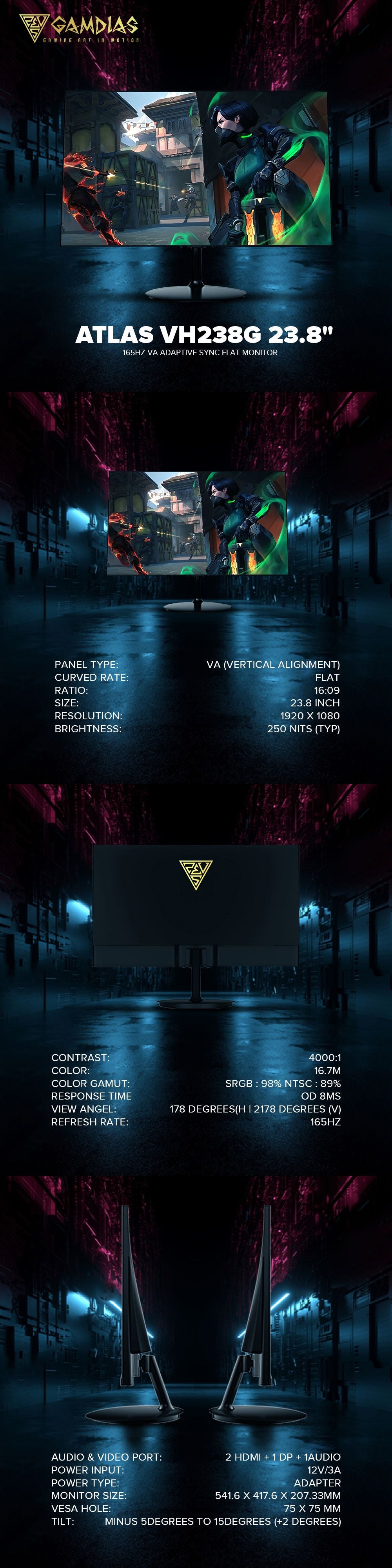 Gamdias Atlas VH238G 23.8″ 165Hz VA Adaptive Sync Flat Gaming Monitor
