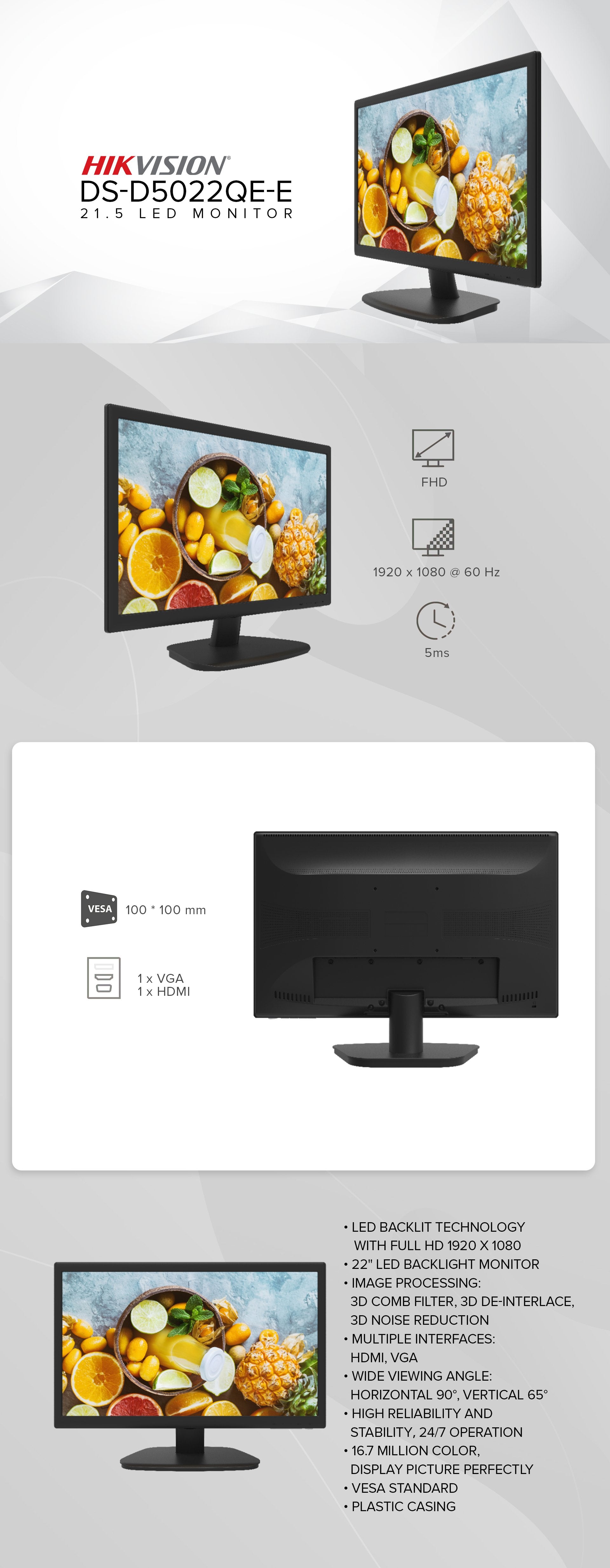 Hikvision DS-D5022QE-E 21.5 1080p Resolution, HDMI,16.7 million color, VGA ready Display Led Monitor
