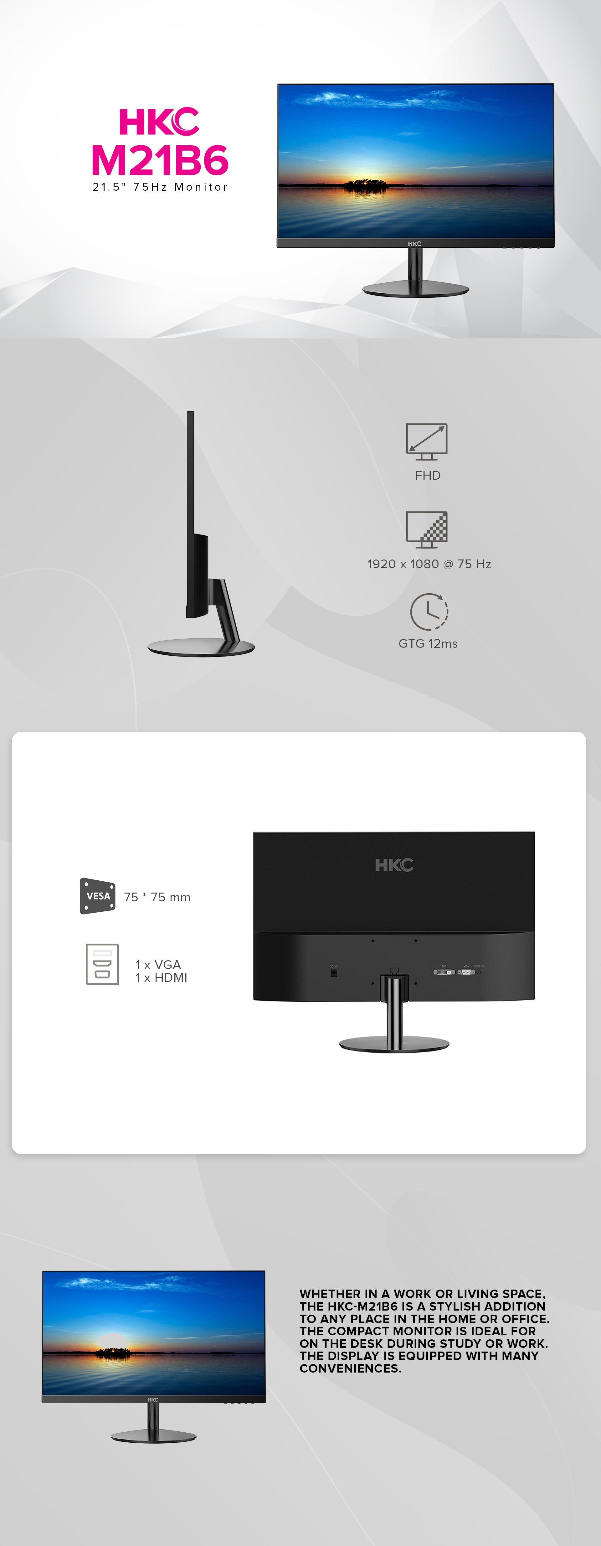 Product Description HKC M21B6 21.5″ Borderless 1920 x 1080 HDMI LED MonitorPANEL: 21.5” Resolution: 1920*1080 Color: 16.7M Brightness: 220cd/m Response Time: GTG 12ms View angle: R/L 178 ,U/D 178 Language: English,French,German,Italian,Spanish,Chinese Audio: Option Power consumption: 30W Power adapter input: DC 12V 2.5A Safety: CE RoSH *1 Year Warranty Parts and Service*