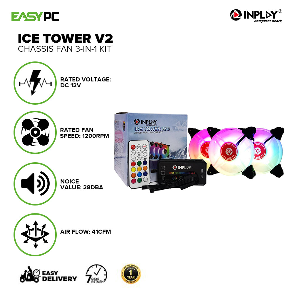 Upgrade your PC cooling with the InPlay Ice Tower V2 3-in-1 Kit. This chassis fan kit delivers optimal airflow, keeping your system cool. With easy installation and customizable RGB lighting, enhance both performance and aesthetics in one sleek package.